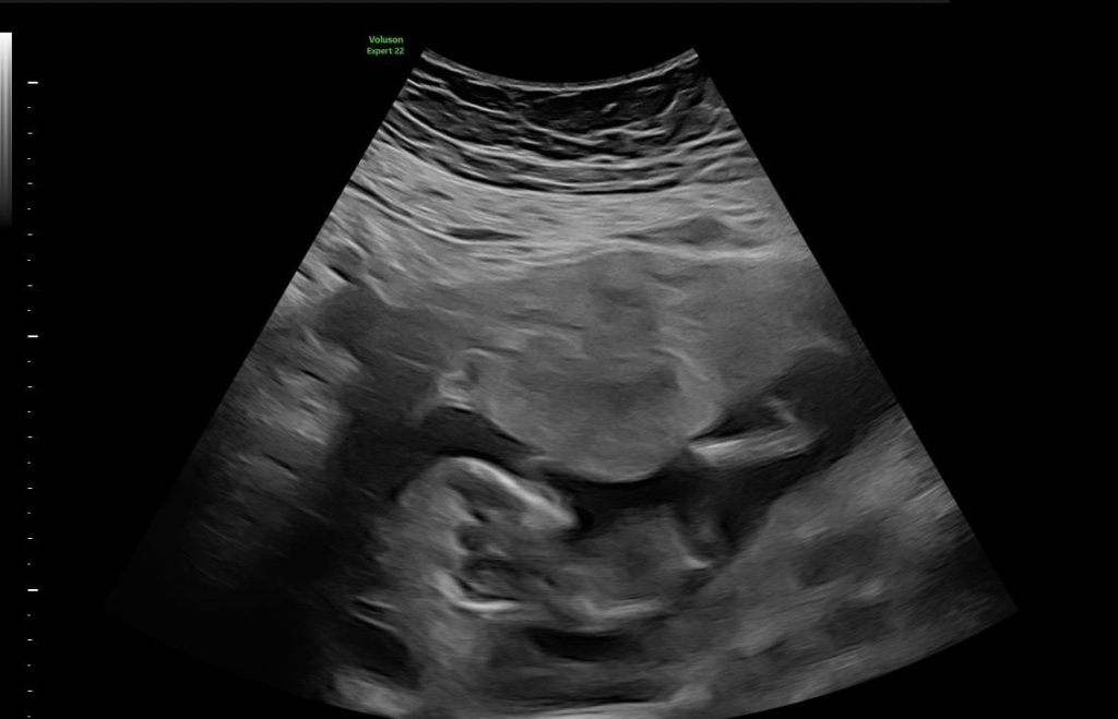 Auf dem Ultraschallbild kann man erkennen, dass sie die Hand vor dem Mund hat.