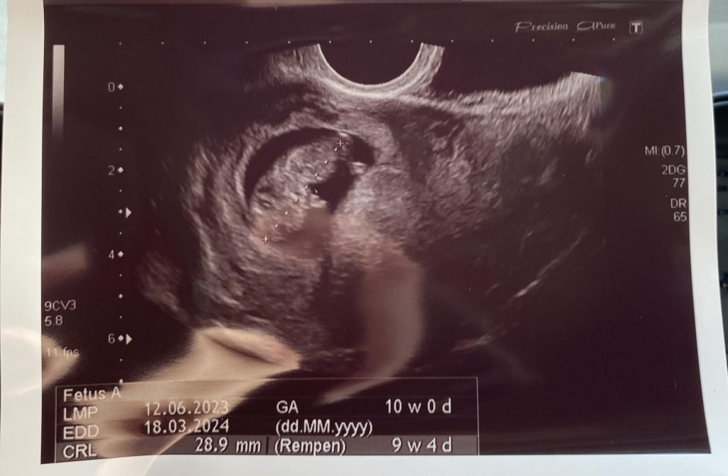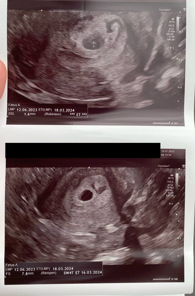 Nach meinem Anruf beim Gynäkologen hatte ich wieder einen Termin bzgl. einer Schwangerschaft ausgemacht. Da hatte ich bereits ein mulmiges Gefühl, weil ich Angst hatte. Mit Nervosität war ich beim Frauenarzt und da meine Gynäkologin nicht da war, wurde ich von der Vertretung untersucht. Diese Gynäkologin hat sofort einen Ultraschall durchgeführt. Und da war es.. die lang ersehnte Fruchthöhle mit einem Pünktchen drin.. ich war so erleichtert, dass ich Tränen bekommen habe. Ich habe mich so gefreut! Es schien so zu laufen, wie es laufen sollte. Es erfolgte noch eine Blutabnahme, um den Beta HCG-Wert zu bestimmen. Als ich die Ärztin fragte, wann ich anrufen soll, um den Wert zu erfahren, sagte sie, dass ich nicht anrufen brauche und diese nur für sie und für die Unterlagen sind. Ganz stutzig schaute ich sie an, denn vorher bei der Eileiterschwangerschaft musste der Wert ständig kontrolliert werden. Alle zwei Tage zur Blutabnahme.. und jedes mal das mulmige Gefühl beim Anruf, ob und um wieviel der Beta HCG-Wert gestiegen ist. Trotz das der Wert bei der ersten Schwangerschaft gestiegen ist, konnte man im Ultraschall nichts sehen.. keine Fruchthöhle, kein Pünktchen.. nichts. Bis der Wert nicht mehr so gestiegen ist, wie er sein sollte.. Und nun schien erst mal alles richtig zu sein. Die Freude kam auf, aber auch gleichzeitig wieder die Angst.. „was ist wenn ich es verliere? was ist wenn das Herzchen nicht schlägt?“ es kamen ganz andere Gedanken dazu, aber die Freude war stärker, sodass ich mich einfach mal freuen konnte! Ich wurde an diesem Termin in SSW 5+4 ausgerechnet. Also war ich in der 6. Schwangerschaftswoche. Der Entbindungstermin wurde für den 18.03.24 berechnet.